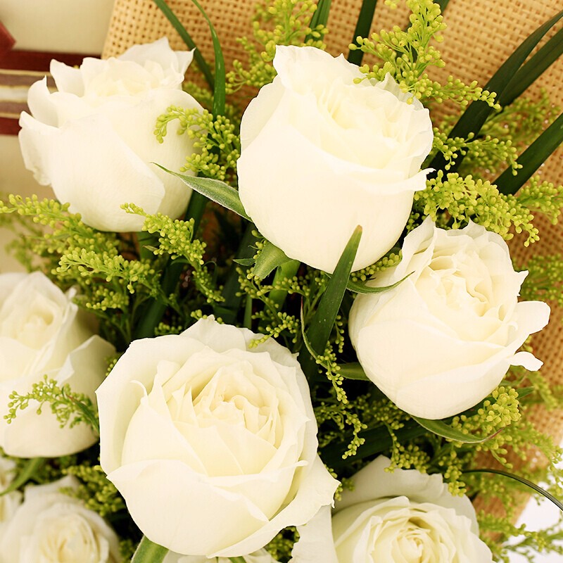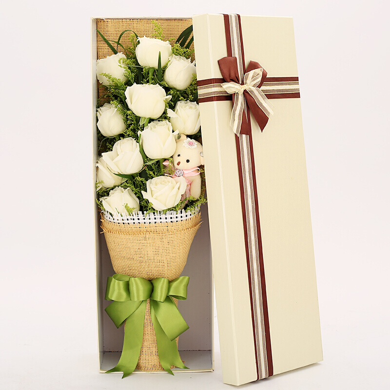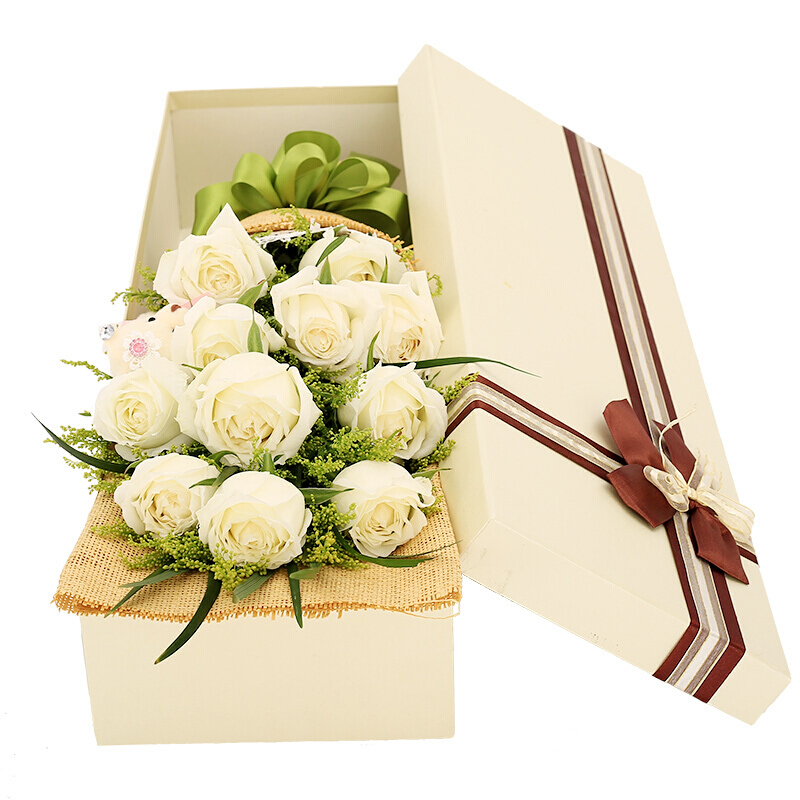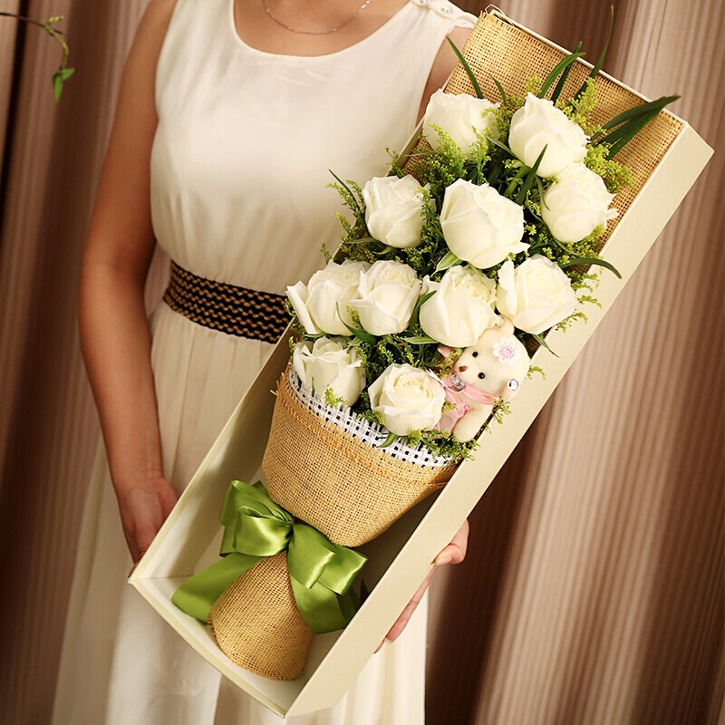 花材: 11支顶级白玫瑰,1只小熊,搭配黄莺、丝带草装饰。