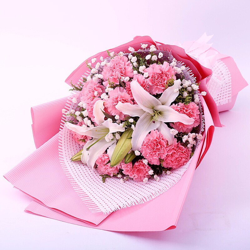 花 材:11朵精品康乃馨,1支多头白色香水百合,搭配黄莺、满天星点缀。