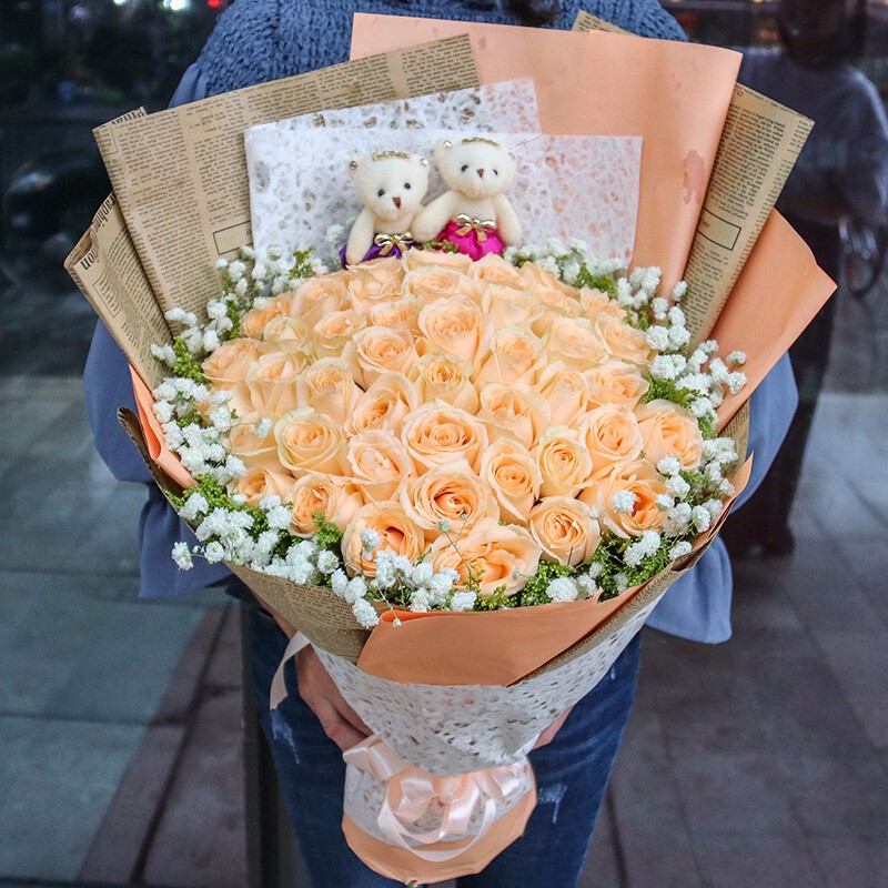 花 材:52支香槟玫瑰,2只可爱公仔,黄莺、满天星装饰。