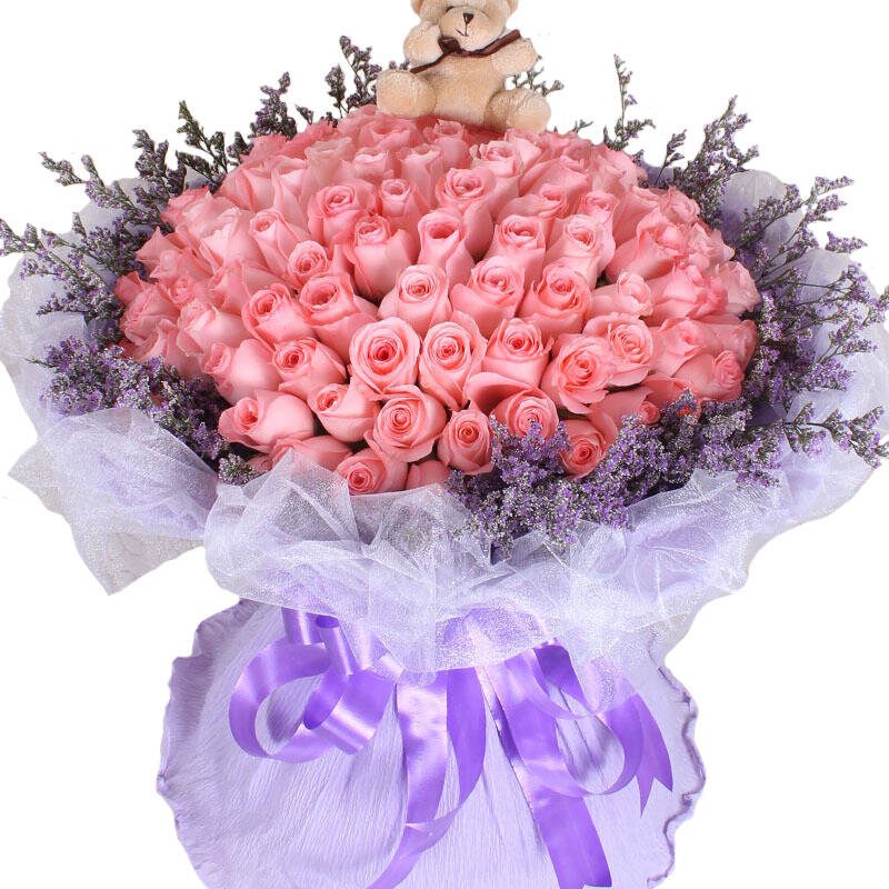 花材: 66朵精品粉玫瑰,1只小熊,水晶草外围。