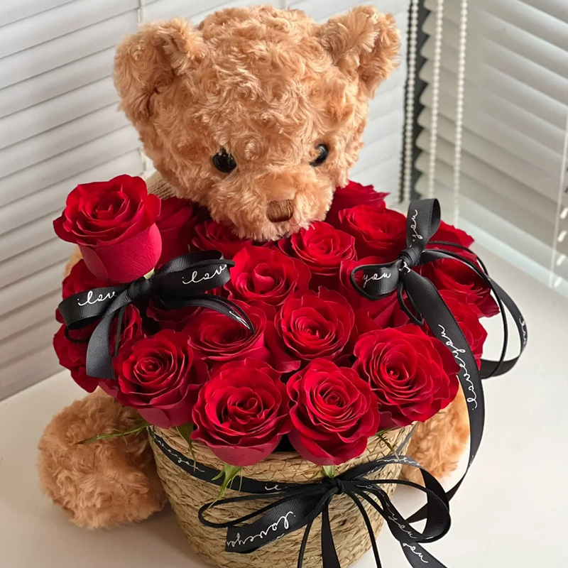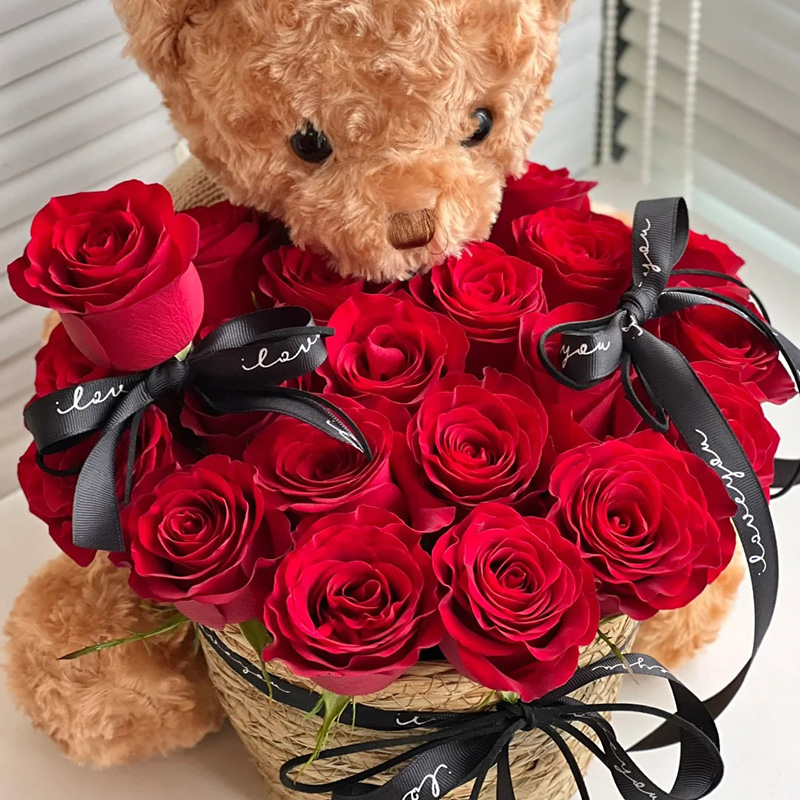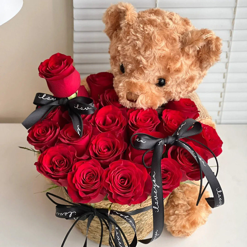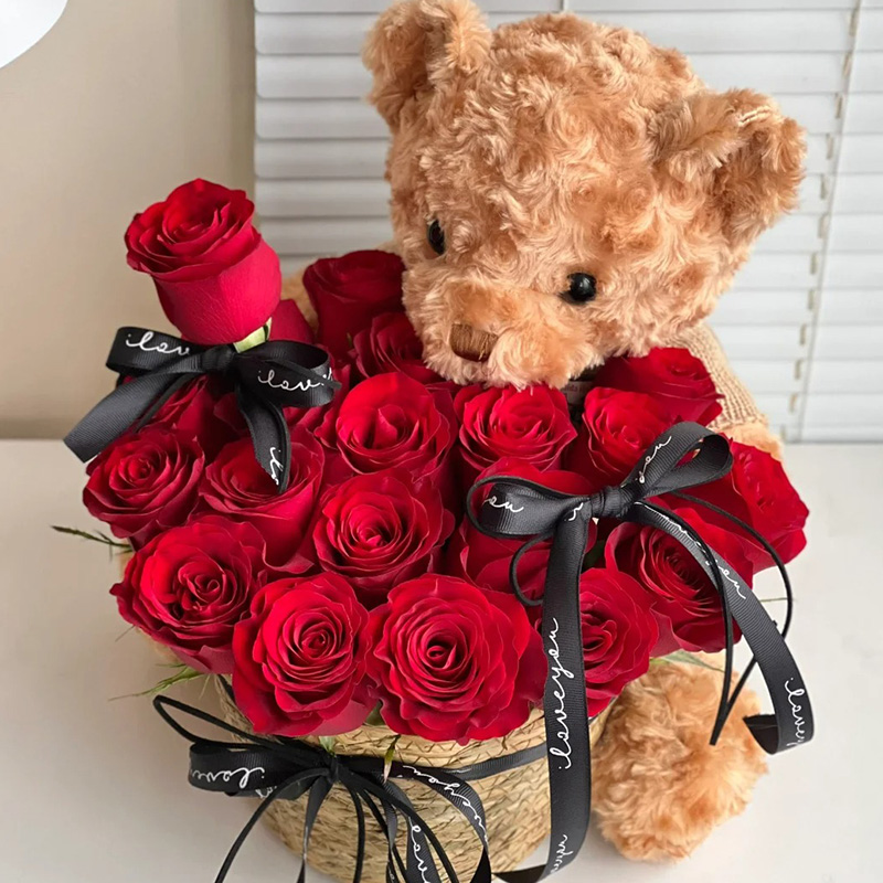 花 材:19支精品红玫瑰,搭配蝴蝶结装饰花朵和篮筐。
