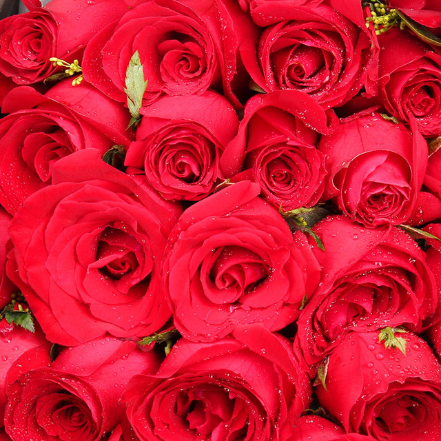 花 材:33朵红玫瑰,搭配栀子叶、满天星。