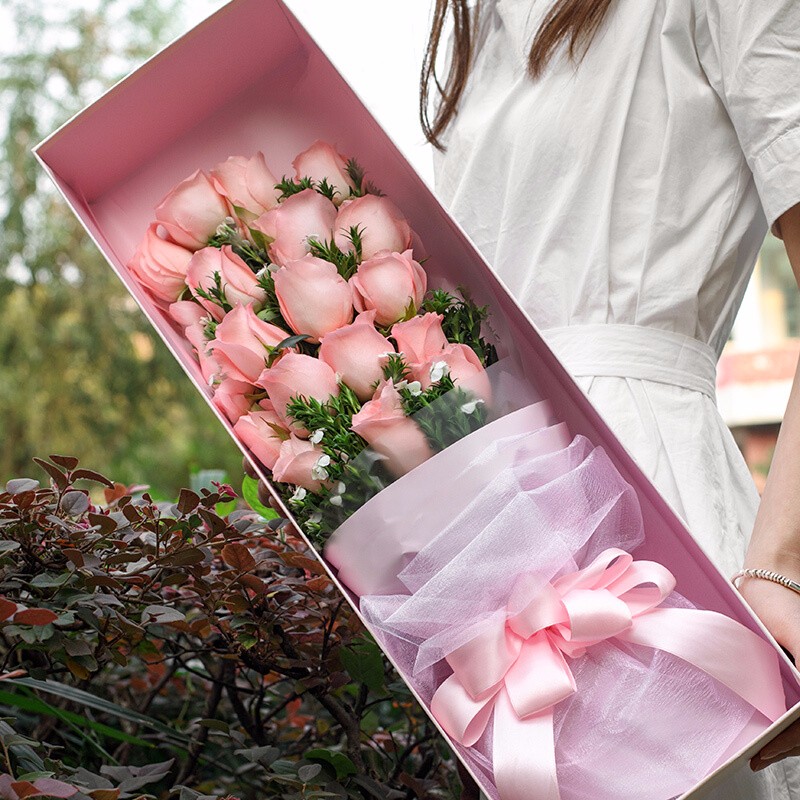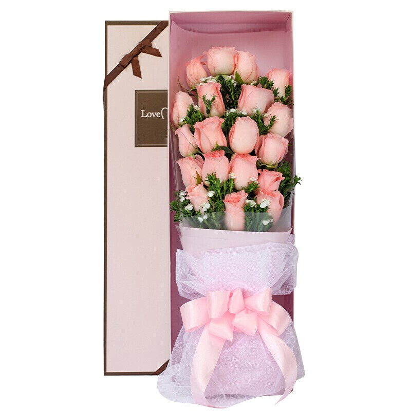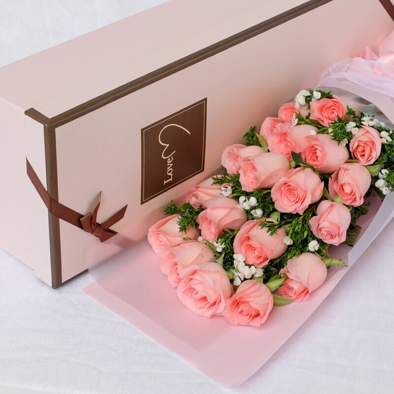 包装: 白色雾面纸内衬、粉色包装,蝴蝶结束扎。精美长方形礼盒。