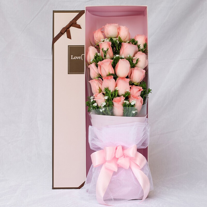 花材: 19枝粉玫瑰,搭配相思梅、黄莺。
