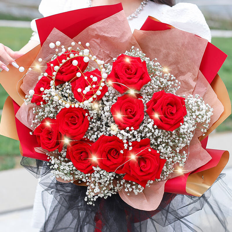 花材: 11枝红玫瑰,1个珍珠皇冠(款式随机),1条串灯,搭配白色满天星。