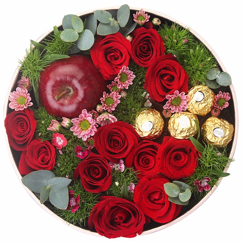 花 材:红苹果1颗、红玫瑰11朵、费列罗巧克力4颗,搭配适量石竹梅、尤加利叶、小菊花装饰。