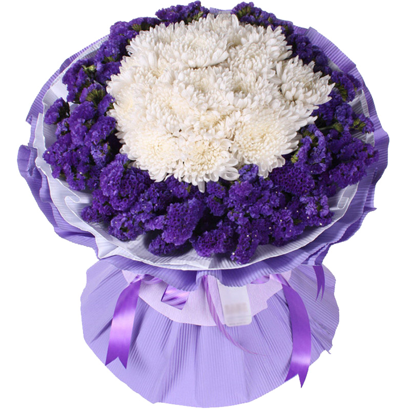 花材: 19支精品白菊花,外围搭配适量紫色勿忘我