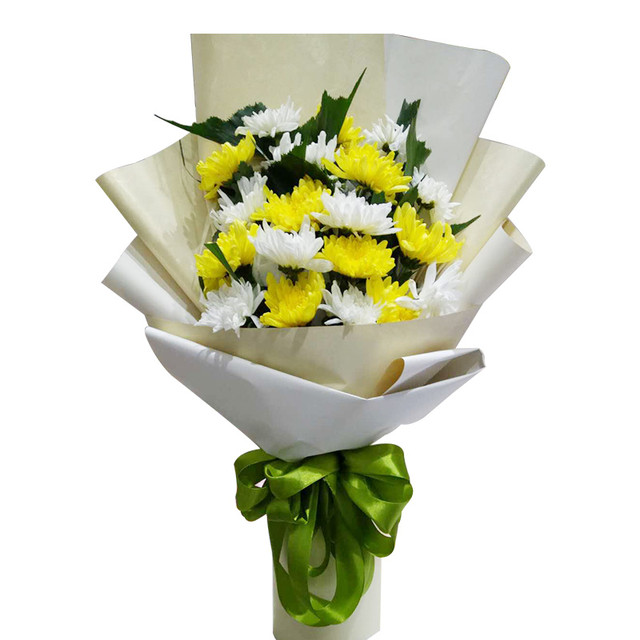 花材: 19朵黄菊花、白菊花混搭,绿叶搭配