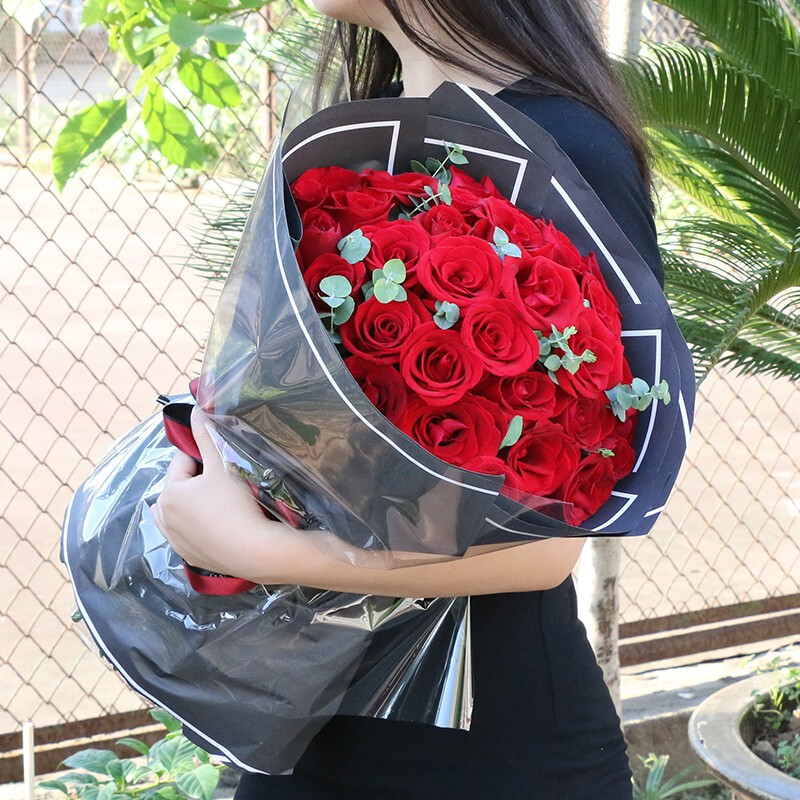 花材: 33朵红玫瑰,搭配尤加利叶装饰。