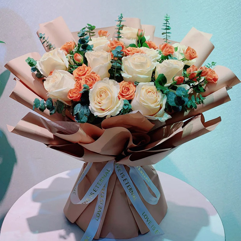 花 材:11朵香槟玫瑰,6支多头橙色小玫瑰,搭配尤加利叶装饰。