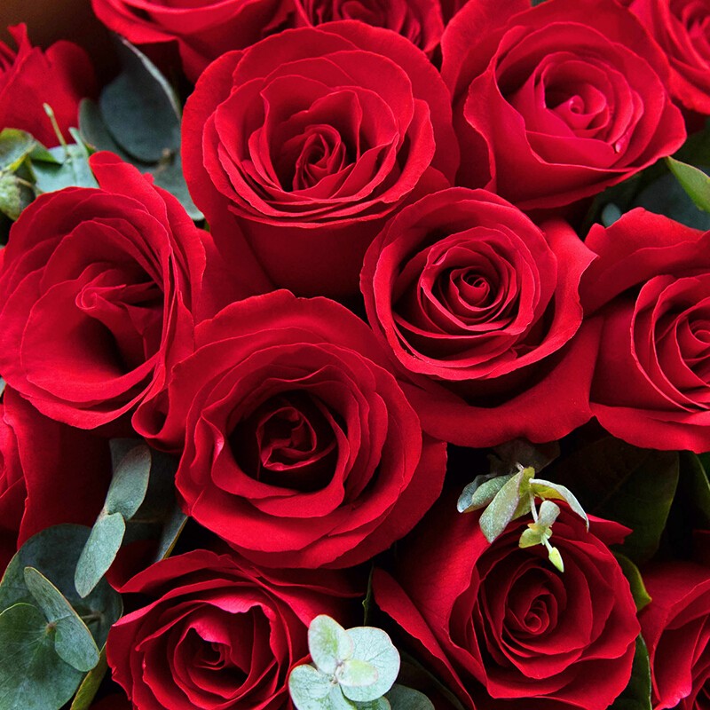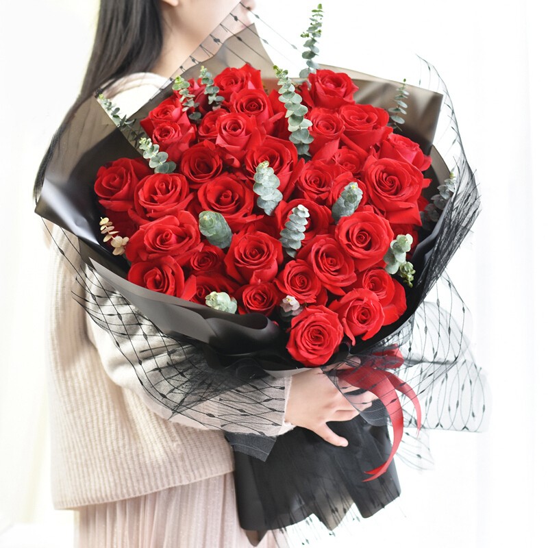 花 材:33朵红玫瑰,进口尤加利叶装饰。
