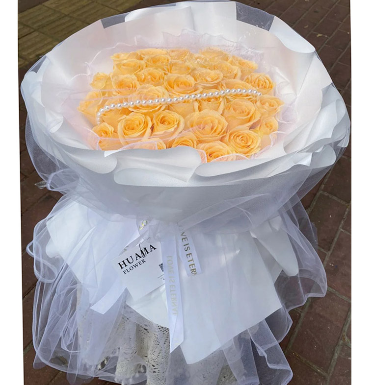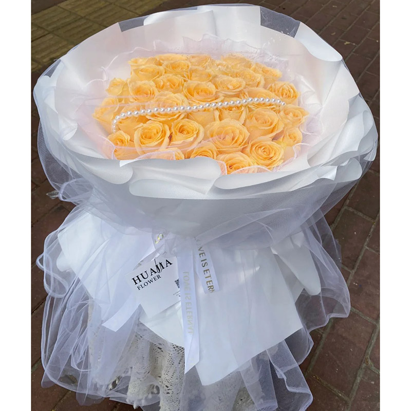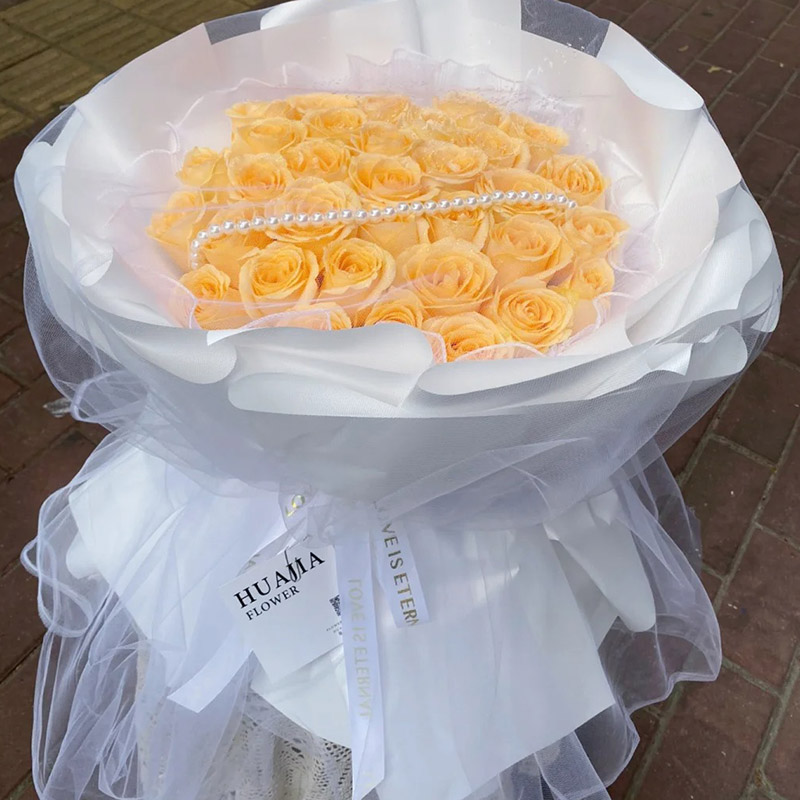 花材: 33朵香槟玫瑰,珠链装饰花面。