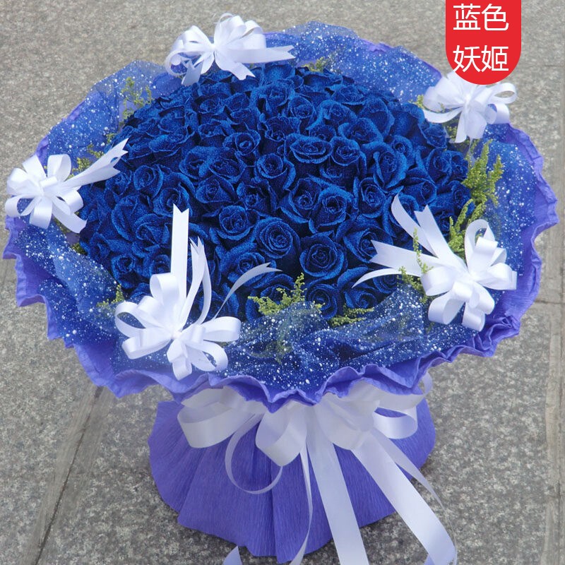 花材: 99朵蓝色妖姬,搭配少量黄莺草外围装饰。