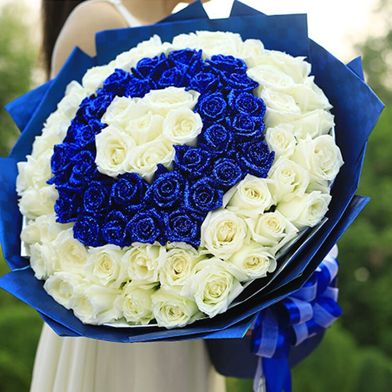 花材: 99朵混搭玫瑰(里面6朵白玫瑰、33朵蓝色妖姬绕2圈,60朵白玫瑰外围环绕)
