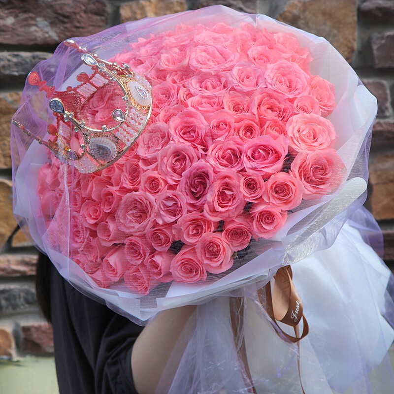 花 材:99朵精品粉玫瑰,搭配皇冠装饰。