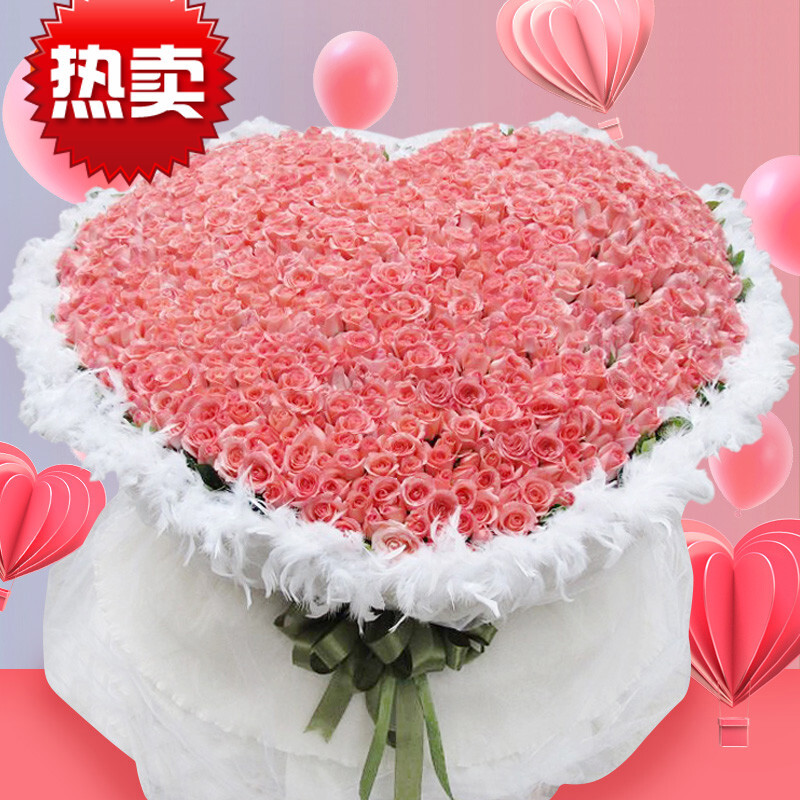花材: 精选999朵极品戴安娜粉玫瑰,周围绿叶点缀。