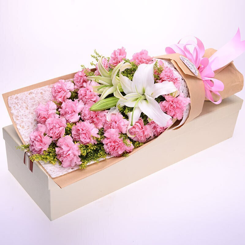 花材: 19朵粉色康乃馨,1支白色香水百合,搭配黄莺草装饰。