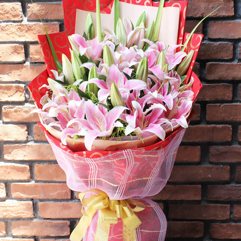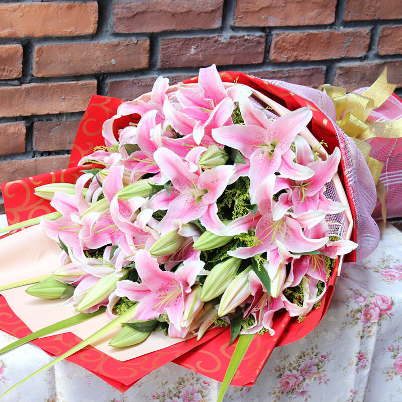 花材: 精心挑选11枝多头香水粉百合,黄莺点缀,搭配剑叶。