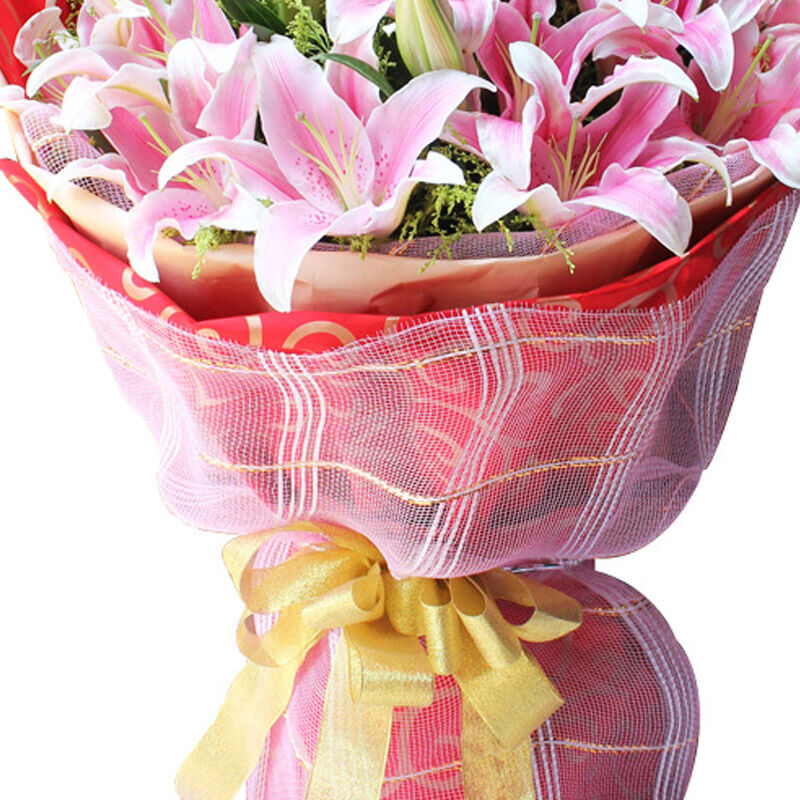 包装: 浅黄色和红色如意纸圆形单面包装,底部粉色硬网和金聪漂亮扎束。