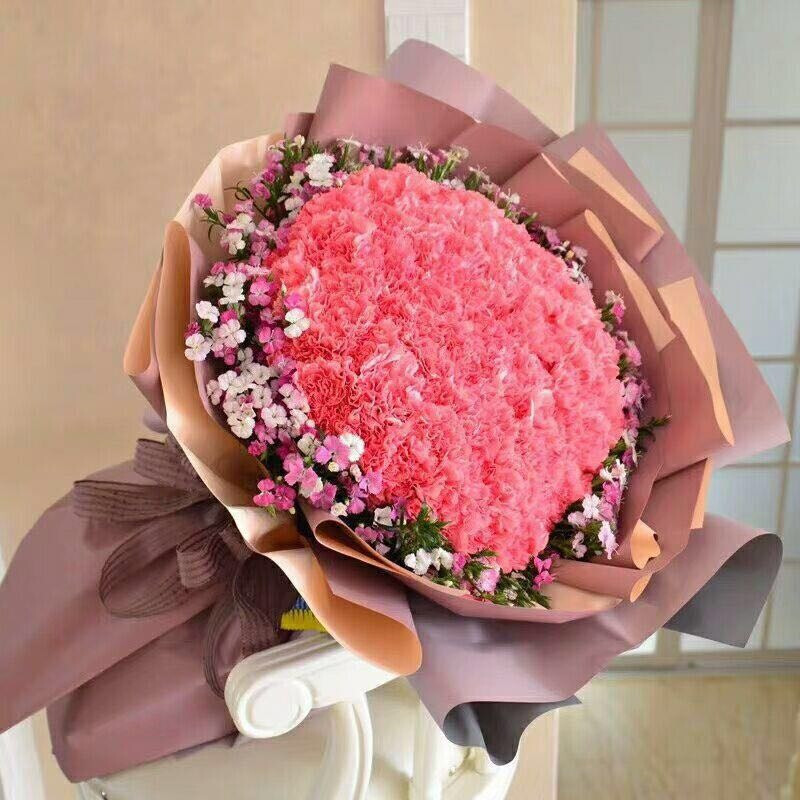 花 材:66支粉色康乃馨,石竹梅外围环绕。