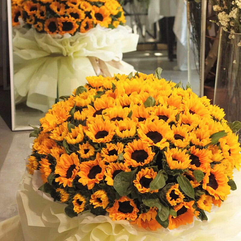 花材: 精选99枝向日葵,白色雪梨纸搭配果冻色韩素纸。