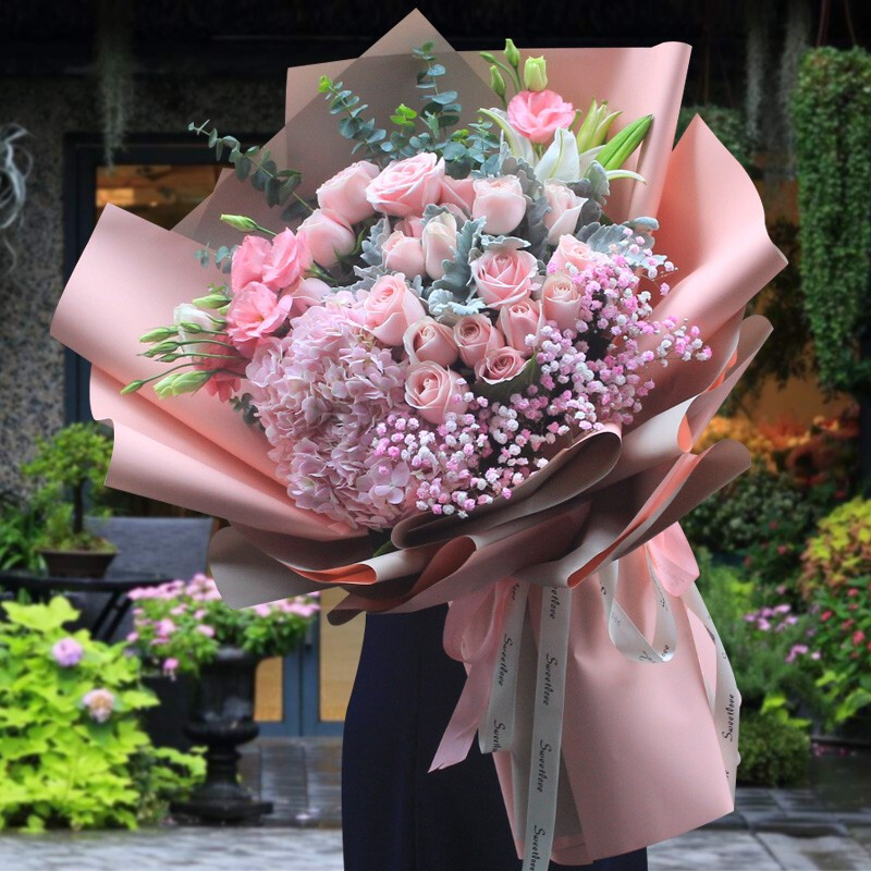 花材: 19朵粉玫瑰,1支粉色绣球花,3支洋桔梗,1支白色香水百合,搭配粉色满天星,尤加利叶,银叶菊装饰。
