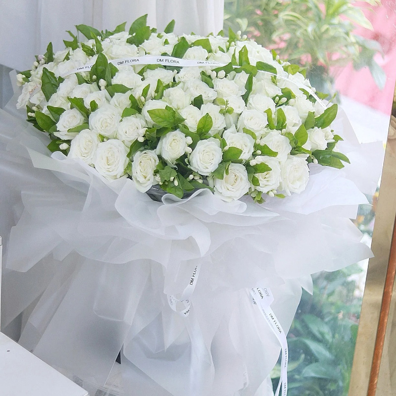 花 材:99朵白玫瑰松散包装,茉莉花丰满间插装饰(若茉莉花不当季断货,则用尤加利叶、栀子叶搭配白色满天星或者洋桔梗装饰)