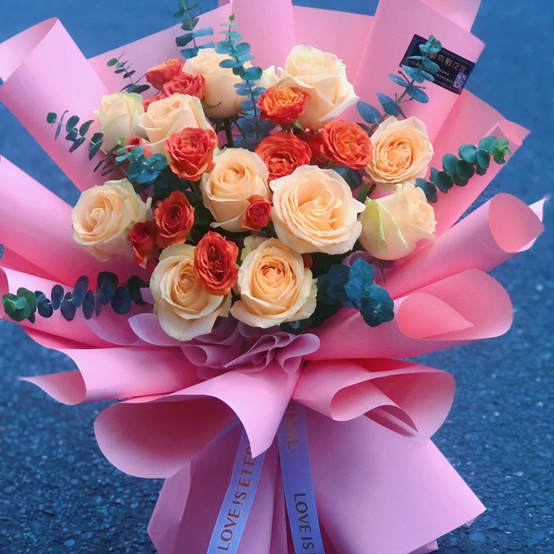 花 材:11朵香槟玫瑰,4支多头橙色小玫瑰,搭配尤加利叶装饰。