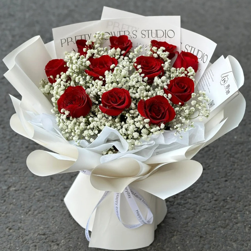 花材: 11朵红玫瑰,搭配满天星丰满间插。