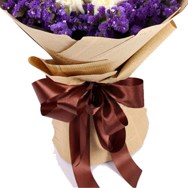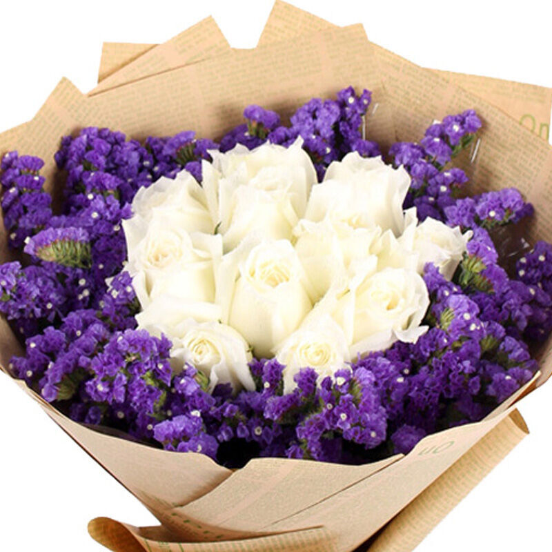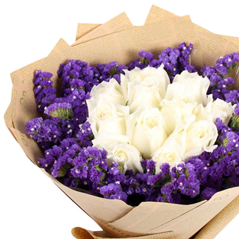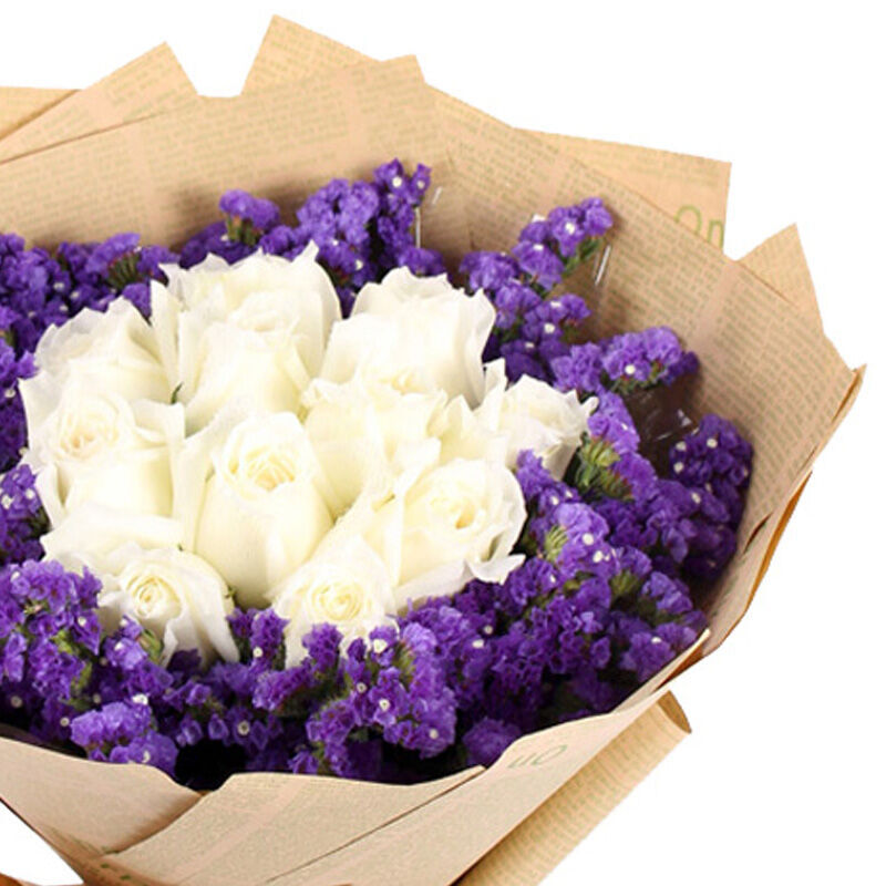 花材: 11朵顶级白玫瑰,搭配勿忘我外围点缀。