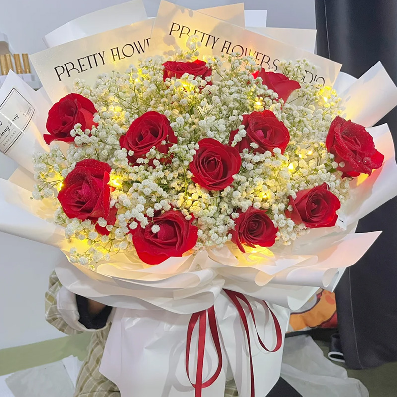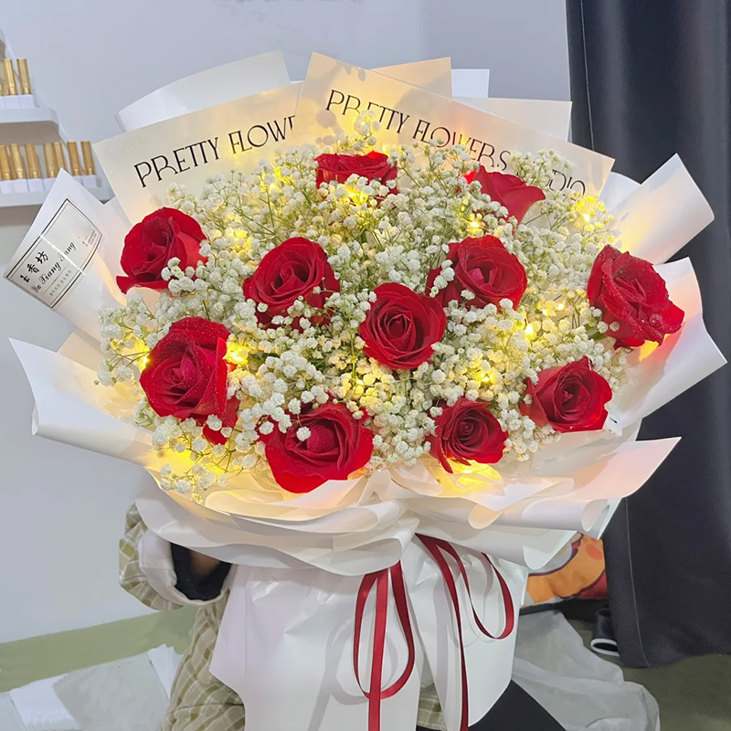 花材: 11枝红玫瑰,1条灯串,搭配白色满天星丰满间插。