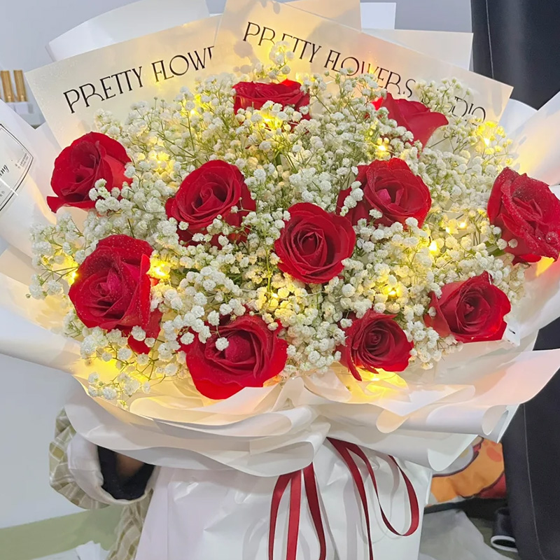 花 材:11枝红玫瑰,1条灯串,搭配白色满天星丰满间插。