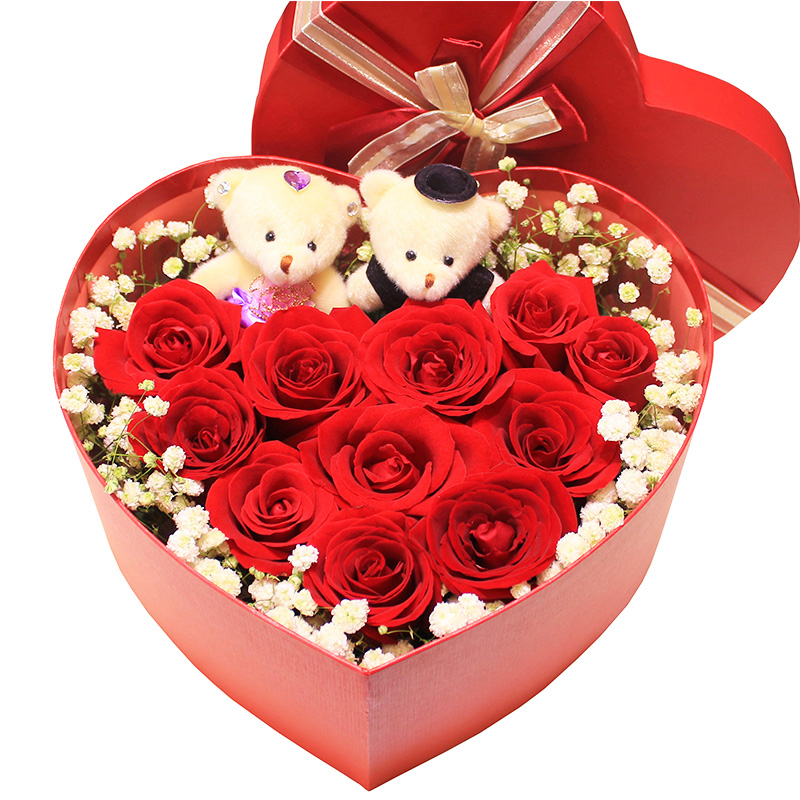 - 花材11支红玫瑰,搭配两只可爱小熊、适量满天星。