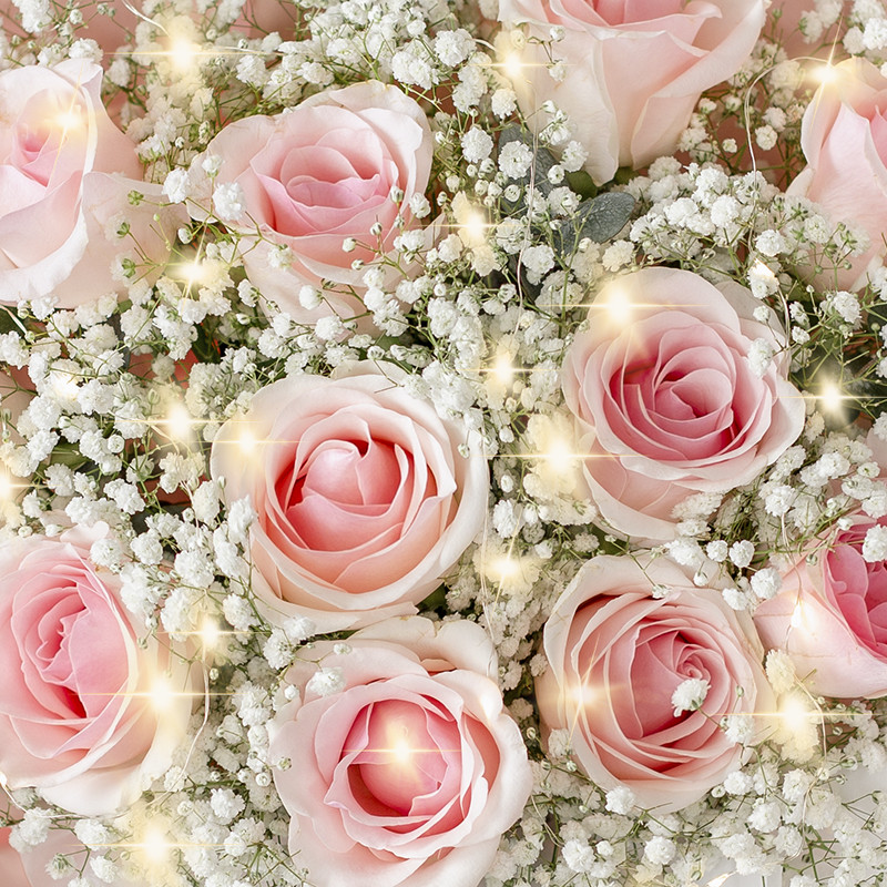 - 念星也念你 - 11朵粉玫瑰,1条灯串,搭配满天星装饰。