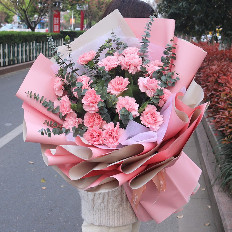 - 花材19朵粉色康乃馨,搭配尤加利叶。