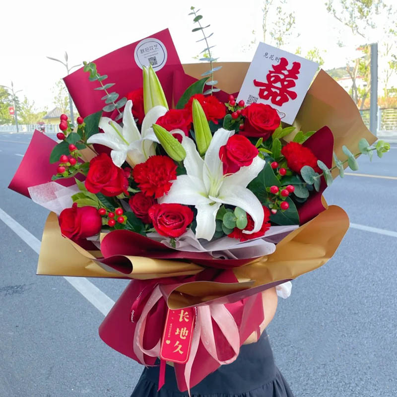 - 花材11朵红色玫瑰与红色康乃馨混搭,2支白色多头香水百合,搭配红豆、尤加利叶装饰。