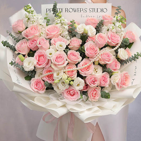 【远方的呼唤】33支精品粉玫瑰,8支多头洋桔梗,1条珠链,搭配白色紫罗兰(非应季则用白色配花代替),尤加利叶装饰。