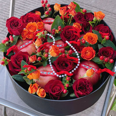 【星河寄语】11枝红玫瑰,1条珠串,5个苹果(每个苹果用红色系丝带缠绕装饰),5枝多头橙色泡泡,红豆、尤加利叶丰满间插。