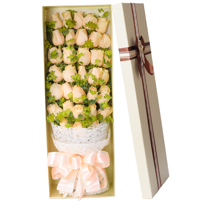 【幸福花语】精选99朵顶级香槟玫瑰,白色满天星环绕。