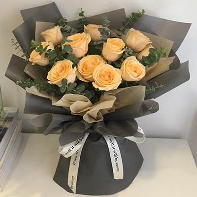 【花样心情】11朵香槟玫瑰,搭配4支洋桔梗(断货则用4支白玫瑰代替),尤加利叶满天星装饰。