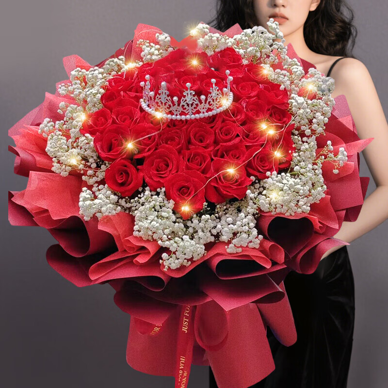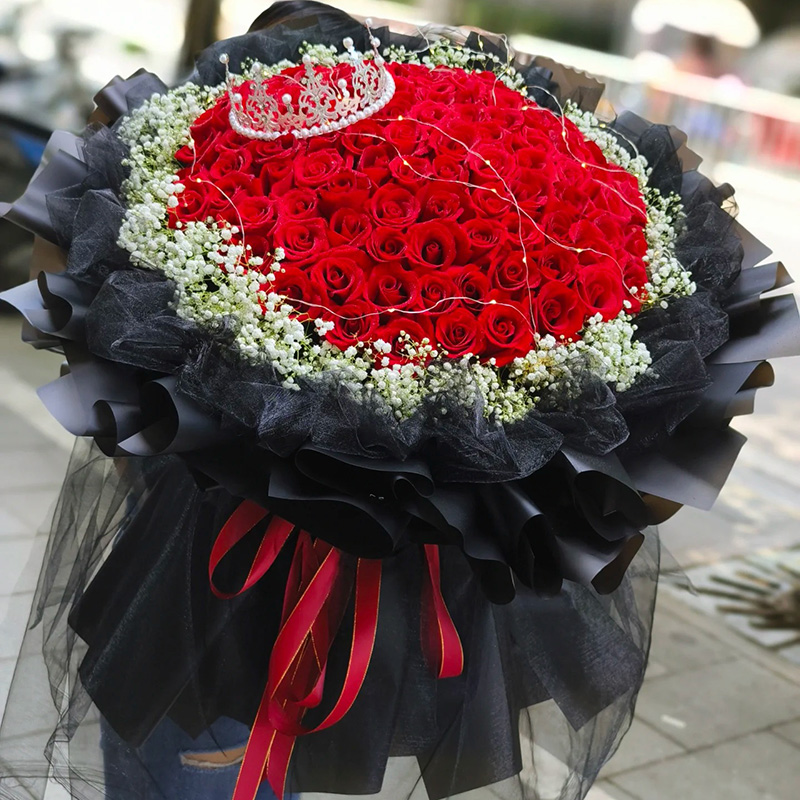 【黑夜之光】99支顶级红玫瑰,搭配皇冠、灯带装饰,满天星环绕。