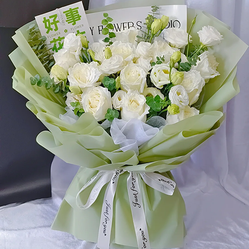 【雪中月色】精选11朵白玫瑰,5枝多头洋桔梗,搭配尤加利叶装饰。