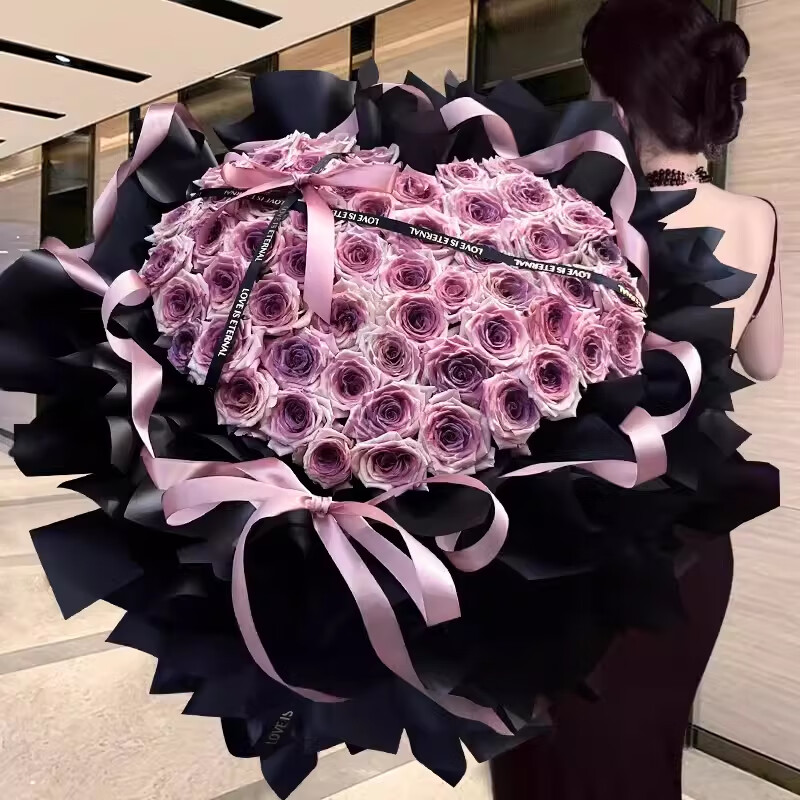 【我的天使】52朵曼塔喷色乌梅子酱花束,心形造型,花面粉色蝴蝶结/黑色英文缎带装饰。(珍贵稀少花材,请提前预订或咨询花艺师)