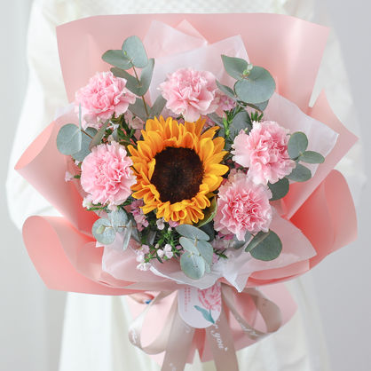 【阳光满溢】4支向日葵,8朵粉色康乃馨,6支粉色洋桔梗,尤加利叶装饰。
