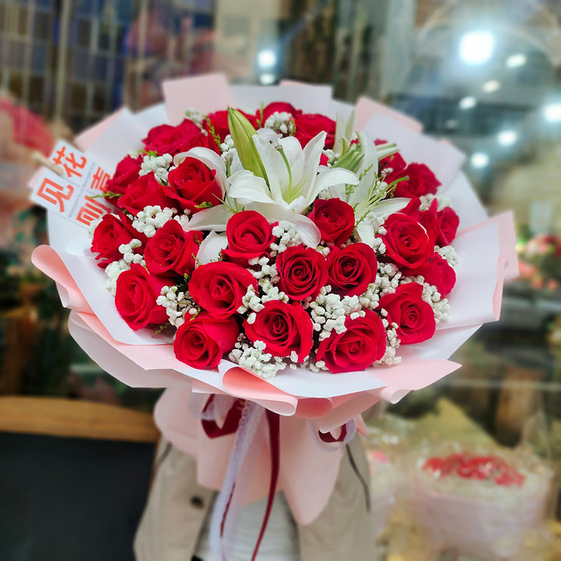 花材: 33朵精品红玫瑰,2支多头白色香水百合,搭配白色满天星丰满间插。