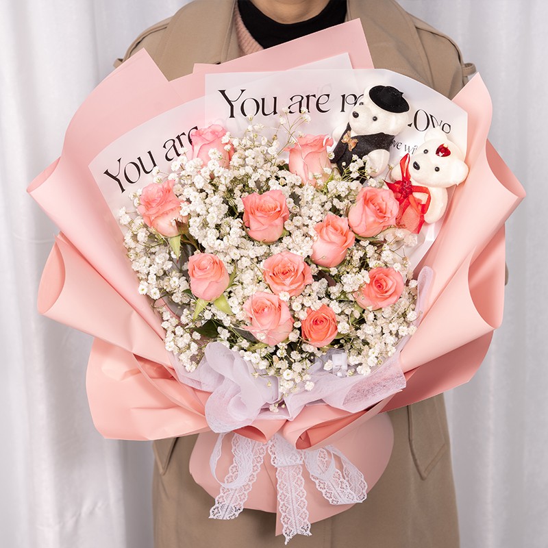 花材: 11枝戴安娜粉玫瑰,1对小熊,1条灯串,搭配白色满天星、尤加利叶丰满间插。