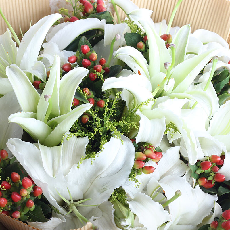 花材: 精选11朵香水百合,搭配相思豆、黄莺点缀。