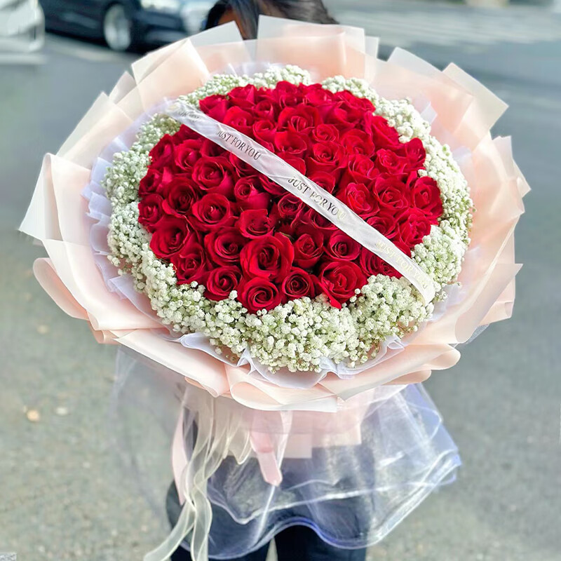 花材: 精选52朵红玫瑰,白色满天星外围环绕,白色英文缎带装饰花面。