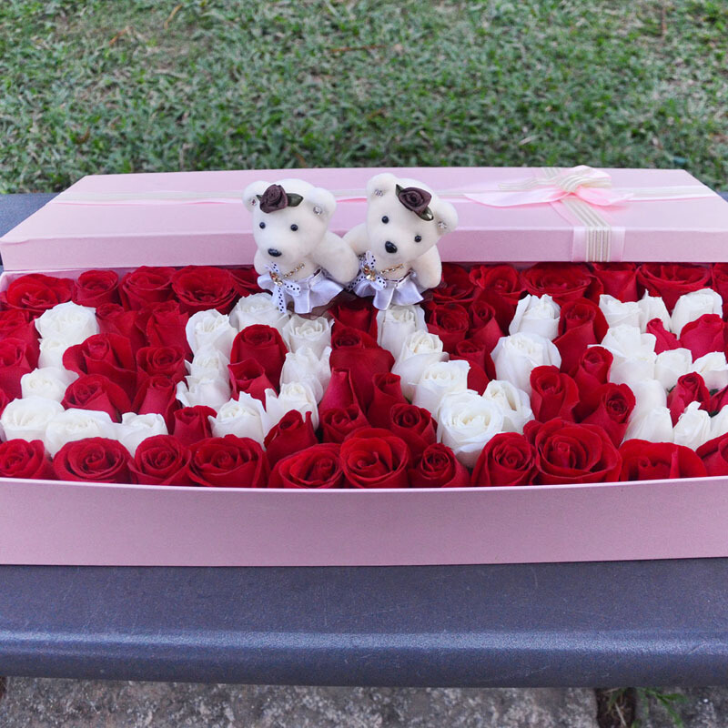 花 材:99枝(红玫瑰+白玫瑰)拼成LOVE字样,一对情侣小熊。