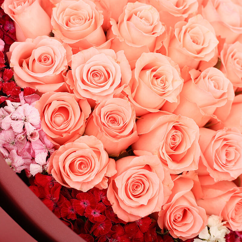 包装: 红色、粉色纸间插多层包装,同色系双色花结。